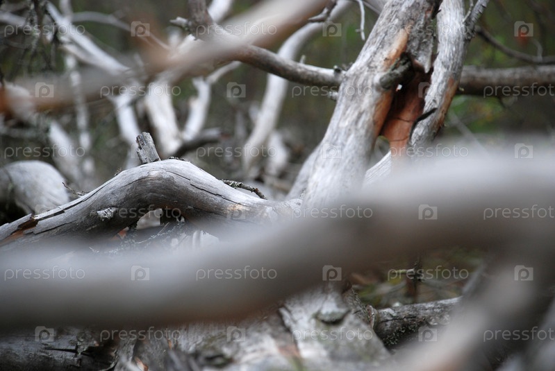 Упавшие ветки деревьев в лесу. В сосновом лесу на земле лежит давно упавшая высокая сосна. У нее длинные изогнутые ветви без коры и хвои. Ветви со временем побелели
