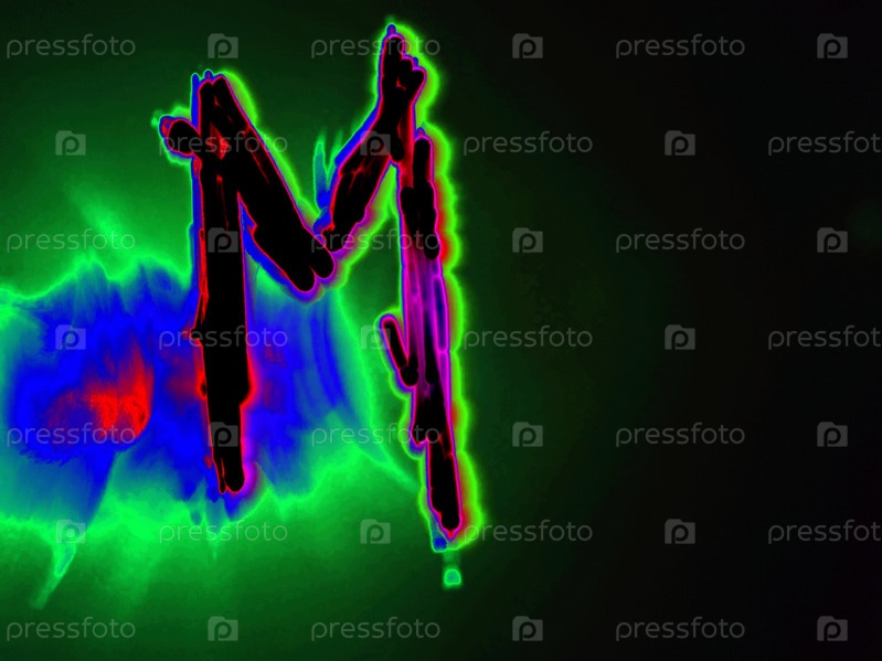Светящаяся английская буква М. На черном фоне с цветными неоновыми линиями от руки написана буква английского алфавита. Буква светится розово-красным светом, создавая вокруг себя зелено-синий ореол