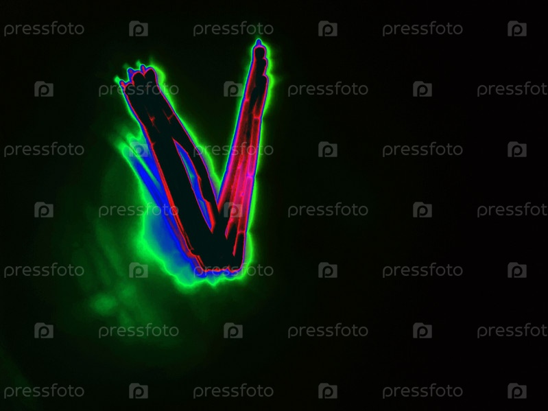 Светящаяся английская буква V. На черном фоне с цветными неоновыми линиями от руки написана буква английского алфавита. Буква светится розово-красным светом, создавая вокруг себя зелено-синий ореол