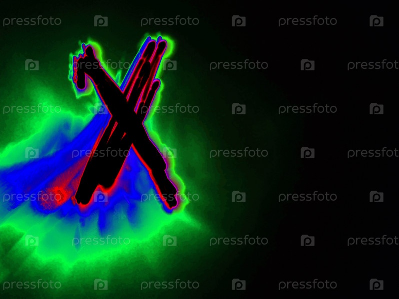 Светящаяся английская буква X. На черном фоне с цветными неоновыми линиями от руки написана буква английского алфавита. Буква светится розово-красным светом, создавая вокруг себя зелено-синий ореол