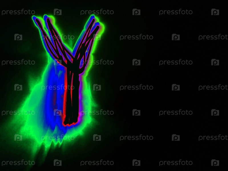 Светящаяся английская буква Y. На черном фоне с цветными неоновыми линиями от руки написана буква английского алфавита. Буква светится розово-красным светом, создавая вокруг себя зелено-синий ореол