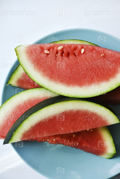 Нарезанные кусочки сочного красного арбуза на синей тарелке. Сочные фрукты летом