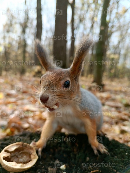 Белка радости полна, замерев с орехом в зубах, смотрит на тебя, взобравшись на пенек в лесу