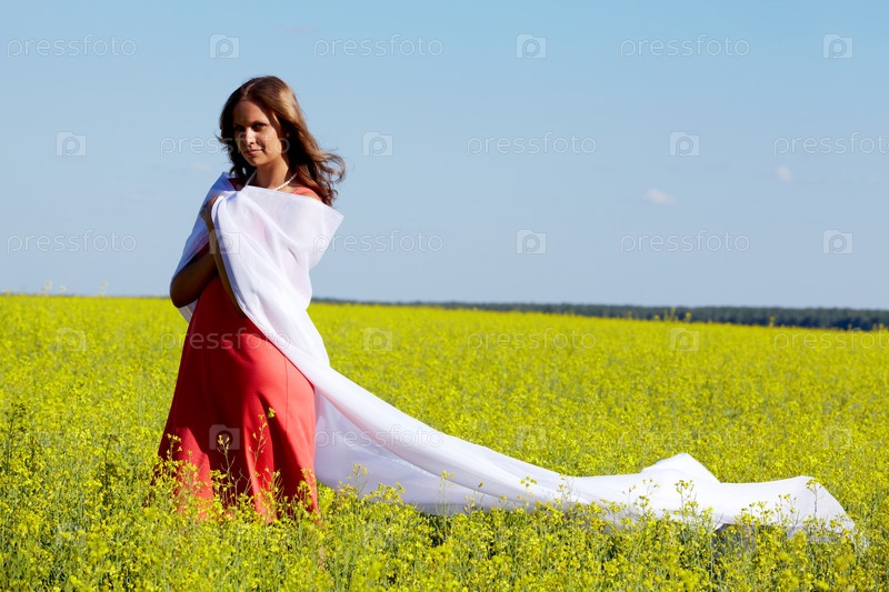 Девушка в поле с накинутым легким полотном