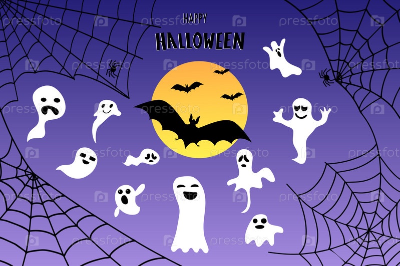 Счастливый баннер Хэллоуина или приглашение на вечеринку с летучими мышами, призраками и паутиной. Векторная иллюстрация