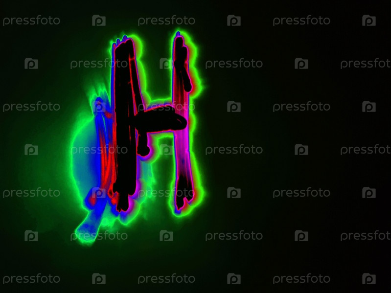 Светящаяся английская буква H. На черном фоне с цветными неоновыми линиями от руки написана буква английского алфавита. Буква светится розово-красным светом, создавая вокруг себя зелено-синий ореол