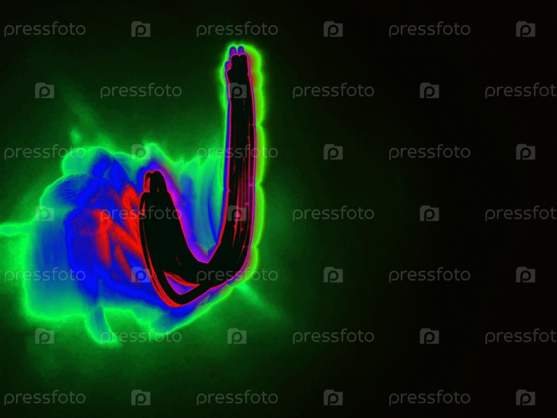Светящаяся английская буква J. На черном фоне с цветными неоновыми линиями от руки написана буква английского алфавита. Буква светится розово-красным светом, создавая вокруг себя зелено-синий ореол