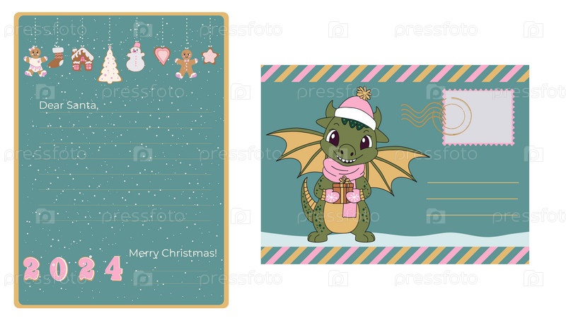 Шаблон рождественского письма Деду Морозу и конверт. Украшенный лист бумаги и конверт с изображением символа дракона 2024 года. Векторная иллюстрация. Вектор