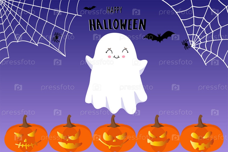Счастливый баннер Хэллоуина или приглашение на вечеринку с летающим призраком Бу, тыквами и паутиной. Векторная иллюстрация. Векторная иллюстрация