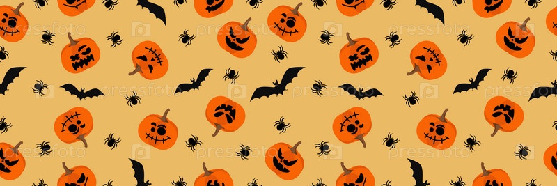 Счастливого Хэллоуина с тыквами, летучей мышью и пауком. Бесшовный узор. Векторная иллюстрация
