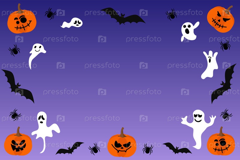 Праздничный фон. Счастливый баннер Хэллоуина. Иллюстрация с летучими мышами, привидениями, тыквами и пауками