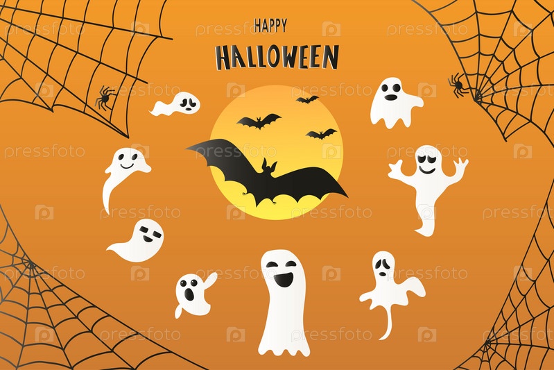 Счастливый баннер Хэллоуина или приглашение на вечеринку. Иллюстрация с летучими мышами, призраками и паутиной. Вектор