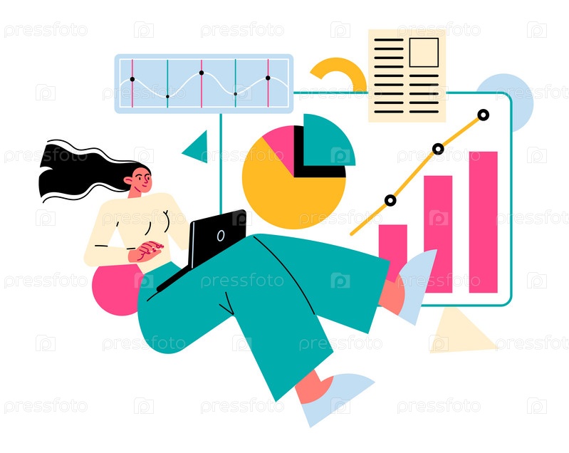 Женщина с ноутбуком работает с данными, графиками, информацией