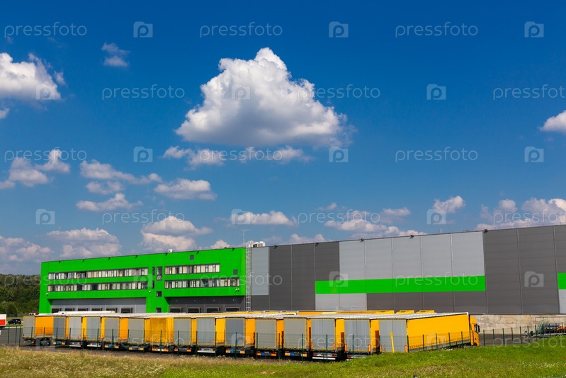 Распределительный склад с грузовыми автомобилями различной вместимости. Станция доставки транспортных услуг. Большой распределительный склад с воротами для грузов и грузовиков