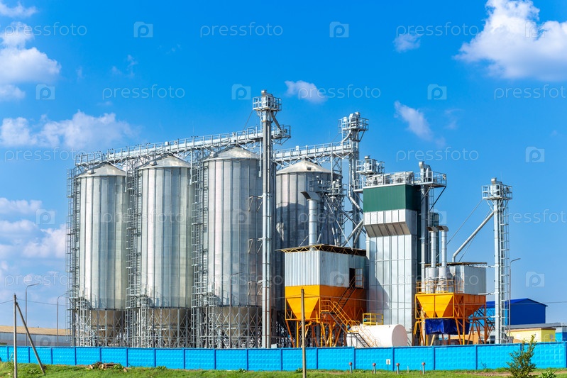 Современный зернохранилище, элеватор и линия очистки семян. Серебряные силосы на агроперерабатывающем комбинате для хранения и обработки, сушки сельскохозяйственной продукции, муки, круп и зерна