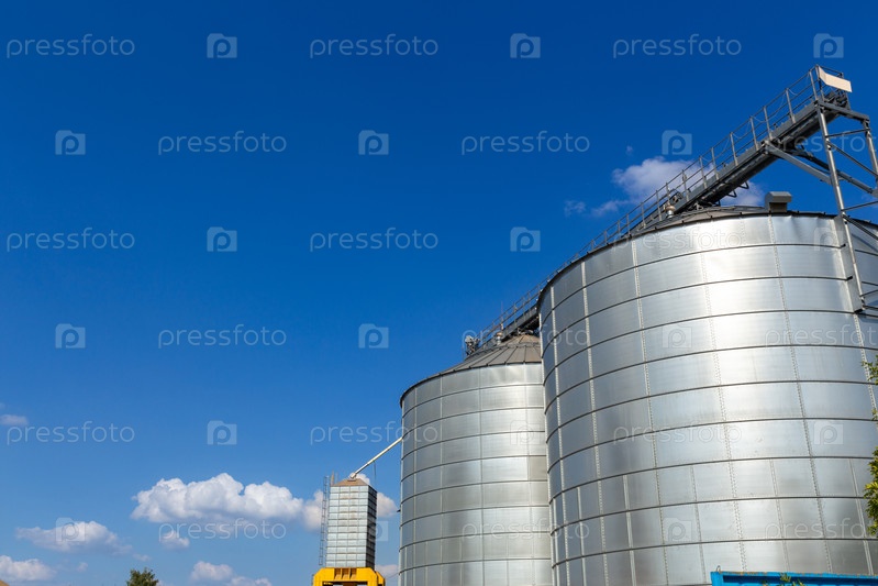 Современный зернохранилище, элеватор и линия очистки семян. Серебряные силосы на агроперерабатывающем комбинате для хранения и обработки, сушки сельскохозяйственной продукции, муки, круп и зерна