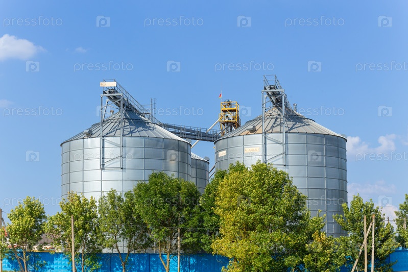 Современный зернохранилище, элеватор и линия очистки семян. Серебряные силосы на агроперерабатывающем комбинате для хранения и обработки, сушки сельскохозяйственной продукции, муки, круп и зерна