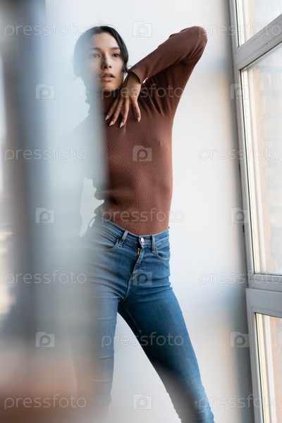 Молодая красивая женщина позирует в джинсах возле окна