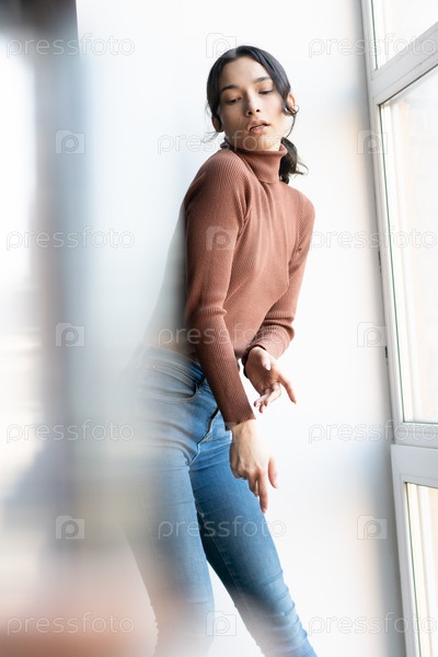 Молодая красивая женщина позирует в джинсах возле окна