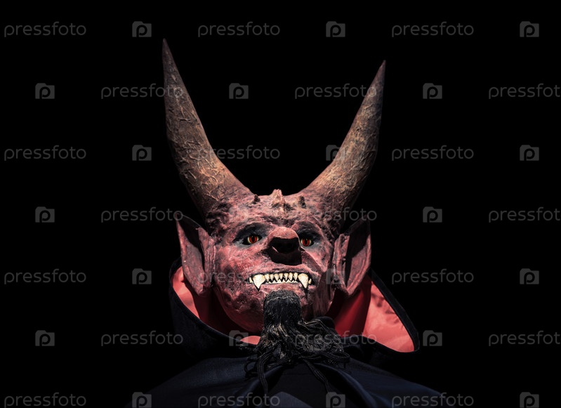 Дьявол с рогами и в черном плаще на темном фоне смотрит вверх