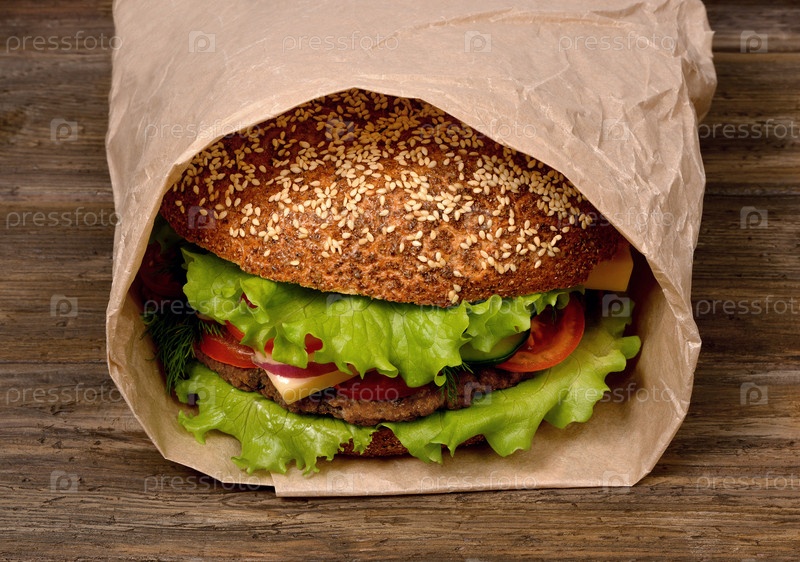 Большой гамбургер на деревянном столе упакован в бумажный пакет