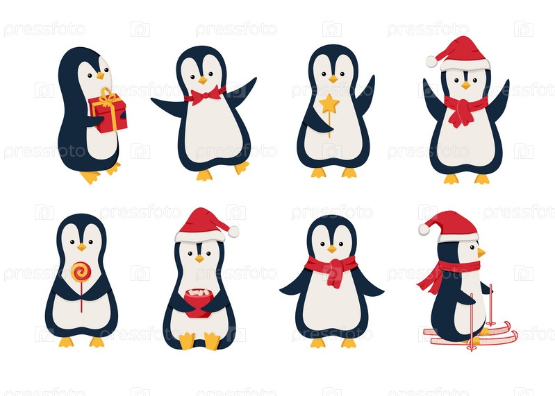 Пингвины устанавливают забавных, мультяшных милых персонажей, празднующих Новый год и Рождество. Векторная иллюстрация концепции зимних каникул