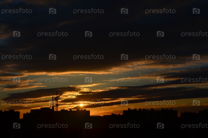 Красивое небо, разноцветные облака во время заката над многоэтажными домами и новостройками большого города
