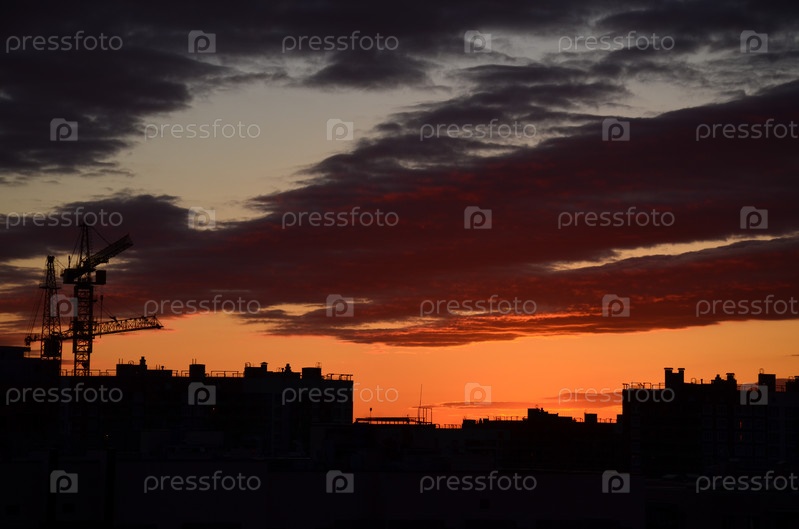 Красивое небо, разноцветные облака во время заката над многоэтажными домами и новостройками большого города