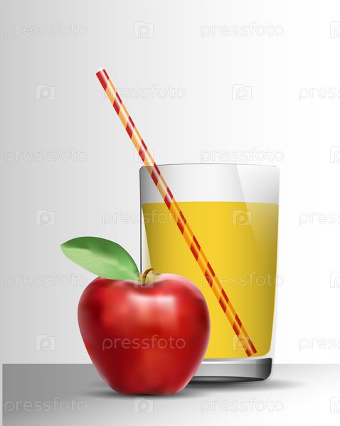 Полезный и вкусный яблочный коктейль или сок в прозрачном стакане с соломкой. Стекло прозрачное на любом фоне. Летнее море. Вектор формата eps 10, без растровых эффектов