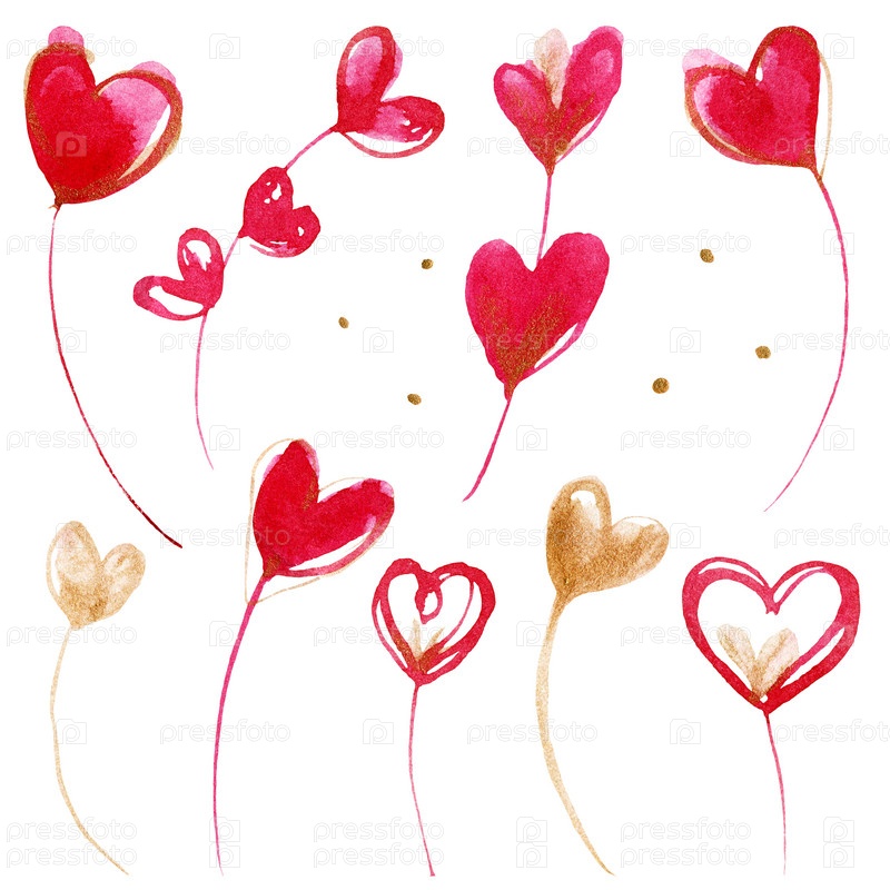 Розовые сердца. Набор романтических акварельных элементов