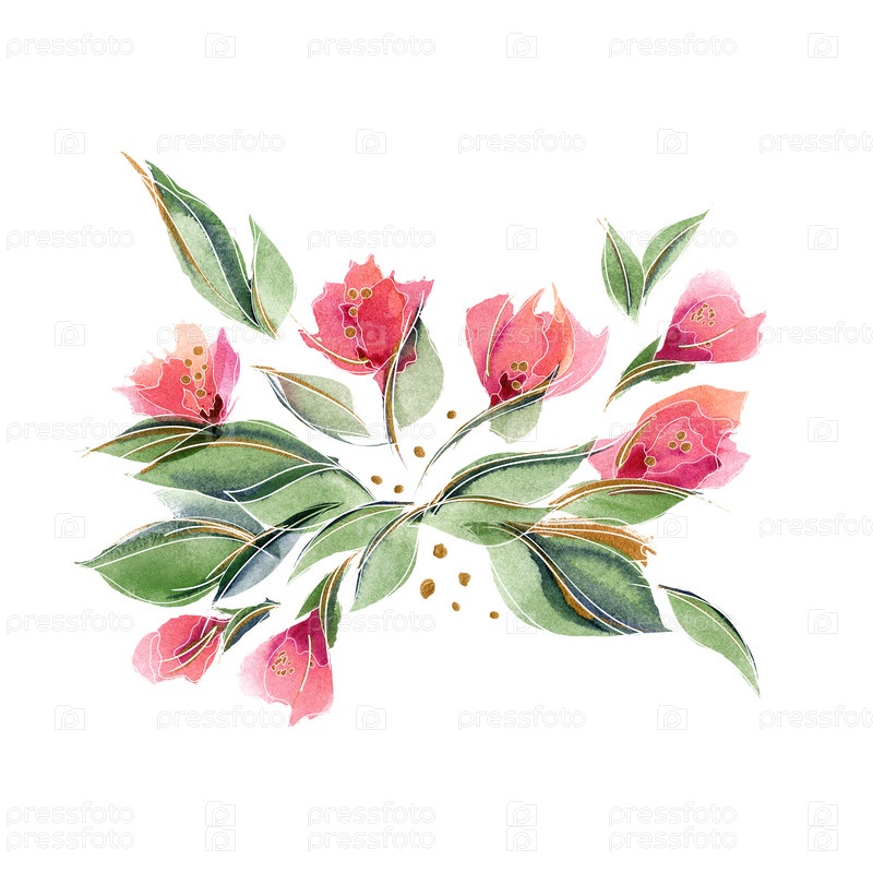 Цветочная композиция с нежными ароматными цветками и листьями розы. Весеннее настроение с акварельным букетом