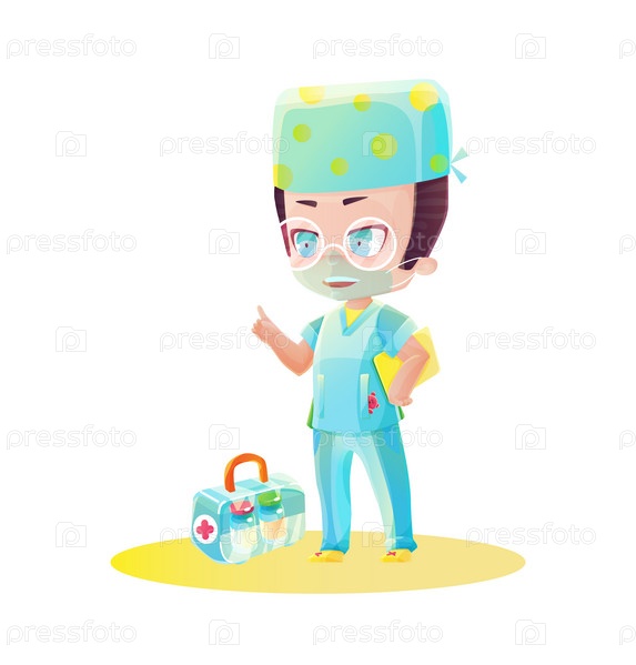 Мультяшный персонаж-мужчина-врач с коробкой вакцины. Рисуем в стиле манга и аниме. Детский мультяшный стиль в ярких цветах