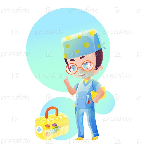 Мультяшный персонаж-мужчина-врач с желтым файлом и коробкой с вакциной. Рисую в стиле мульт манги и аниме. Милый персонаж в ярких цветах