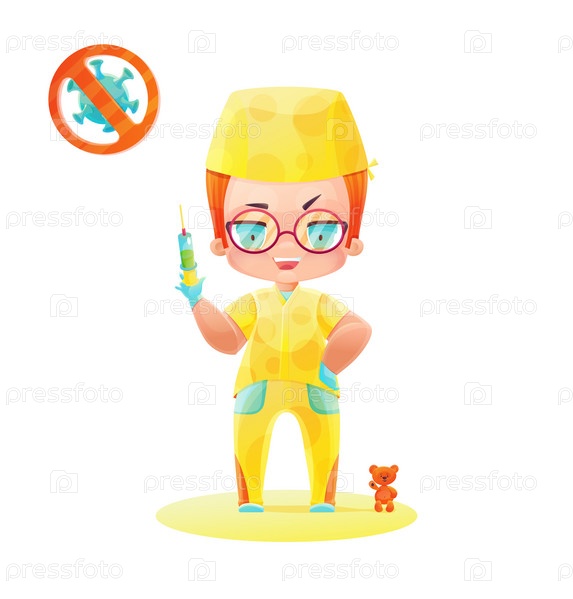 Медсестра в желтой форме со шприцем с вакциной и игрушечным медведем. Рисую в стиле мульт манги и аниме. Милый персонаж в ярких цветах