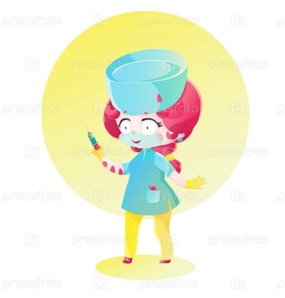 Милая медсестра с розовыми волосами держит в руках шприц. Рисунок в стиле манга. Детский мультяшный стиль в ярких цветах
