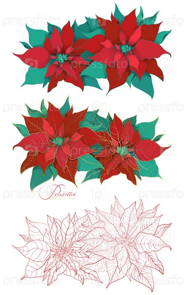Цветущая ветка рождественского растения пуансеттия. Ветка зеленых и красных листьев с филигранной золотой линией. Элегантные и роскошные украшения для рождественских торжеств