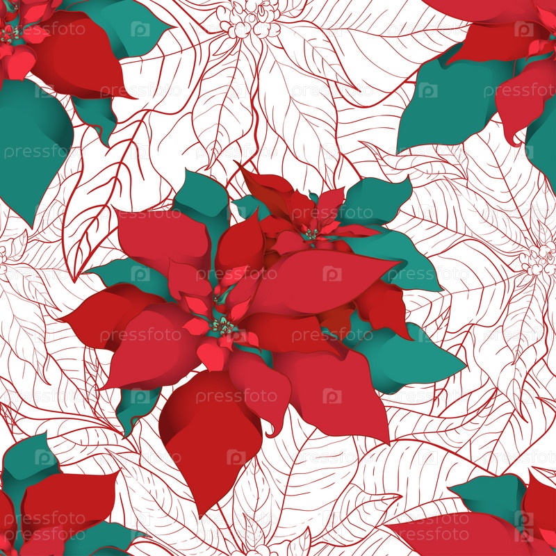 Зимняя пуансеттия бесшовный узор для рождественской упаковки и оберточной бумаги или текстиля. Шелковые листья Пуансеттии с красной линией на белом фоне