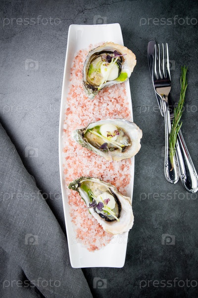 Свежие устрицы на соли Красного моря на белой тарелке, вид сверху