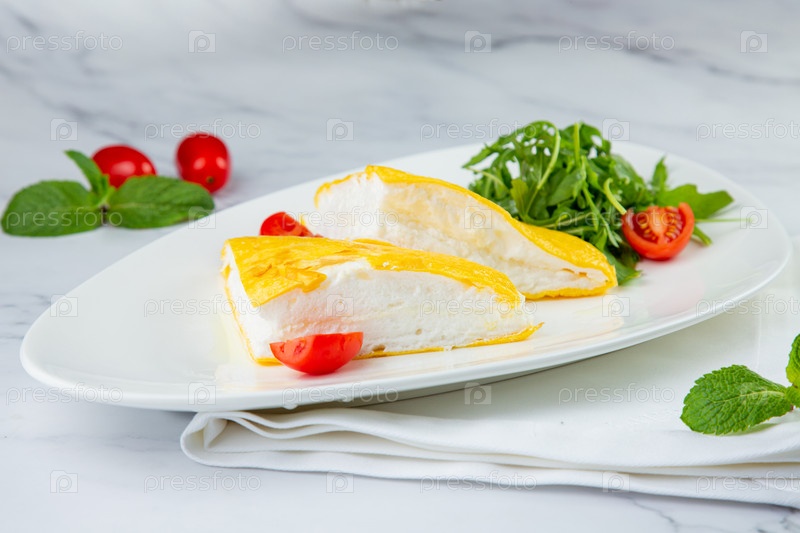 Французский высокий омлет с рукколой и помидорами черри, вид сбоку