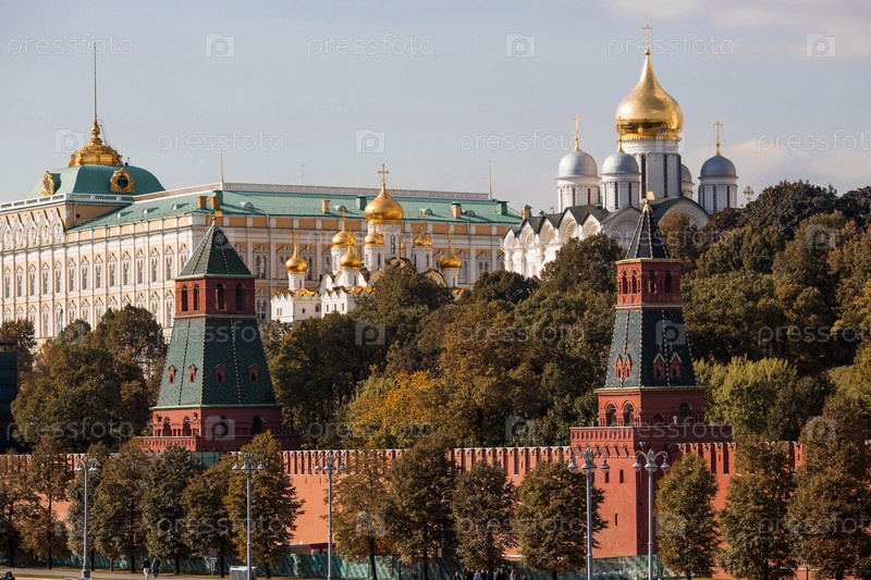 МОСКВА, РОССИЯ - 26 СЕНТЯБРЯ 2023 г.: Вид на Москву осенним вечером на закате. Кремлевские башни. Большой Кремлевский дворец, Успенский и Благовещенский соборы. Популярная туристическая достопримечательность
