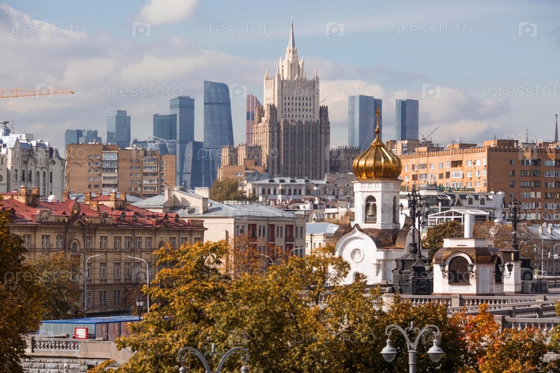 Русский православный собор. Храм Христа Спасителя на фоне Министерства иностранных дел Российской Федерации и Москвы-Сити в солнечный осенний день. Российская Федерация, Москва, сентябрь 2023 г