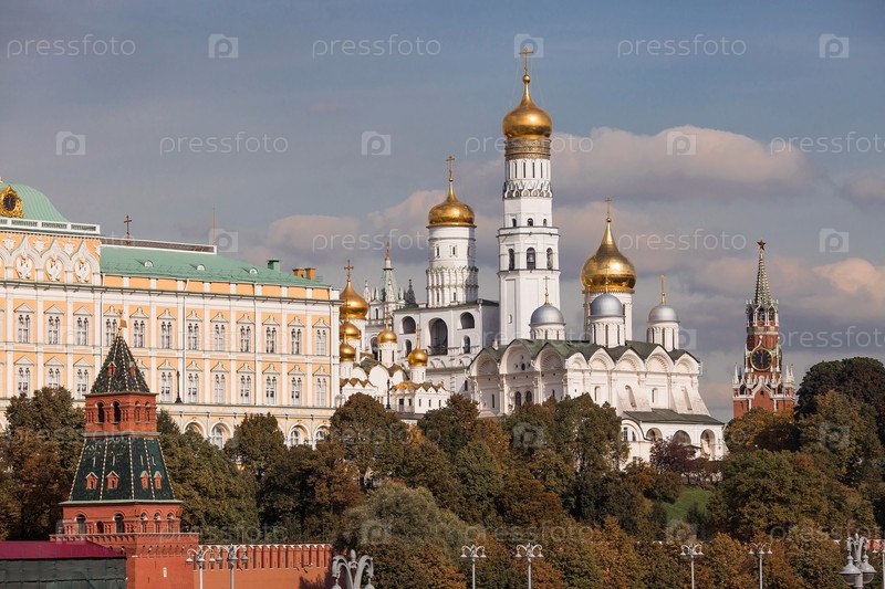 МОСКВА, РОССИЯ - 26 СЕНТЯБРЯ 2023 г.: Вид на Москву в осенний день. Кремлевские башни. Большой Кремлевский дворец, колокольня Ивана Великого и Успенский собор. Популярная туристическая достопримечательность