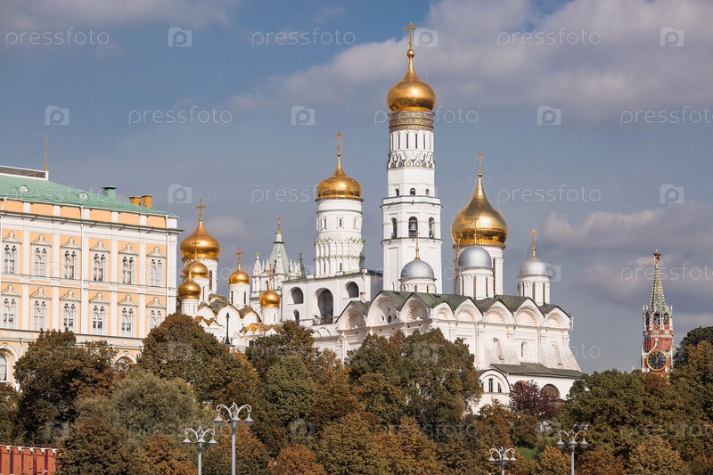 МОСКВА, РОССИЯ - 26 СЕНТЯБРЯ 2023 г.: Вид на Москву в осенний день. Кремлевские башни. Большой Кремлевский дворец, колокольня Ивана Великого и Успенский собор. Популярная туристическая достопримечательность