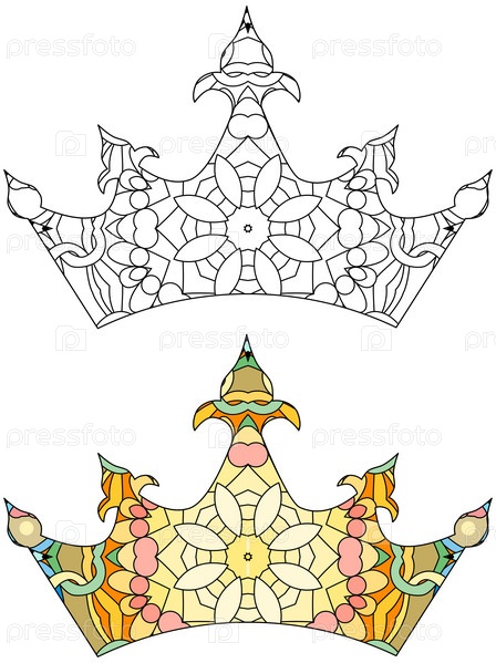 Корона в стиле зентангл для дизайна футболок, раскрашивания, татуировок и других украшений. Набор цветов и контуров