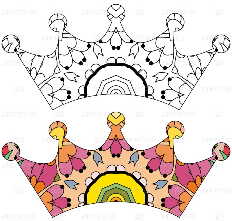 Корона в стиле зентангл для дизайна футболок, раскрашивания, татуировок и других украшений. Набор цветов и контуров