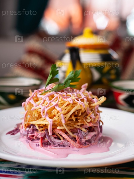 Салат «Гнездо глухаря» из свеклы, пирожкового картофеля, маркови и зелени, заправленный майонезом. Азиатский стиль