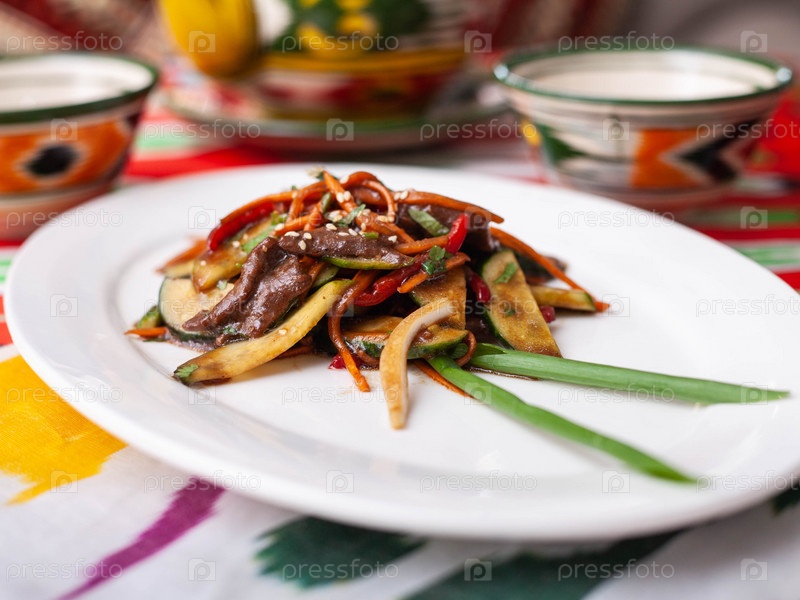 Восточный теплый салат. Обжаренные кусочки говядины, маркови и огурцов в соусе и кунжуте. Азиатский стиль