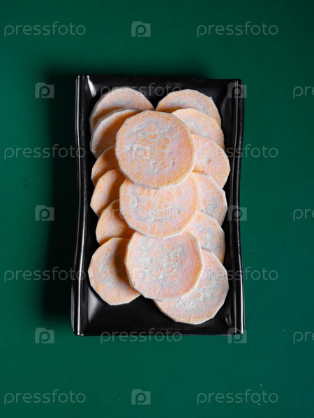 Ломтики сладкого картофеля на черной тарелке. Вид сверху. Китайская кухня, ингредиент для тушеного мяса