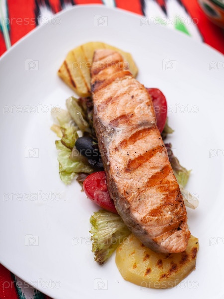 Стейк лосося на подушке из тушеных овощей. Азиатский стиль