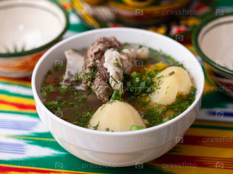 Суп Сурпа из отварной говядины, картофеля и лука по восточному рецепту. Восточная кухня, национальное блюдо